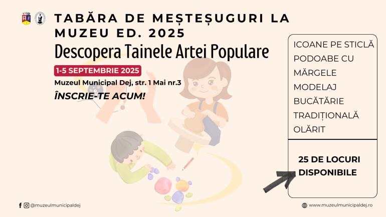Muzeul Municipal Dej vă invită să descoperiți farmecul tradițiilor românești în cadrul Taberei de Meșteșuguri – ediția 2025, organizată în perioada 1 – 5 septembrie 2025.